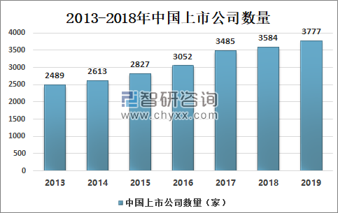 智研咨询发布的《2020-2026年中国股票行业投资潜力分析及市场规模预测报告》数据显示:2013-2019年中国上市公司数量逐年增加,2018年中国上市公司数量为3584家,2019年中国上市公司较2018年增加了193家,达到3777家。