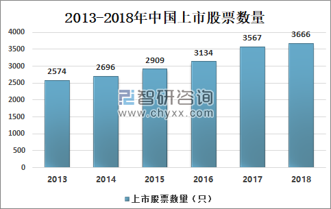 根据中国统计年鉴数据显示,2013-2018年中国上市股票数量呈不断增加走势,2018年中国上市股票数量为3666只,较2017年增加了99只。
