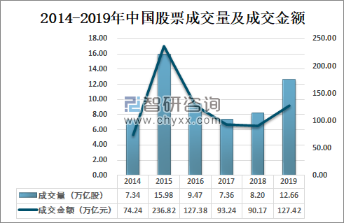 2015-2017年中国股票成交量及成交金额均呈下降走势,随后开始回升;2019年中国股票成交量为12.66万亿股,较2018年增加4.46万亿股;2019年中国股票成交金额为127.42万亿元,较2018年增加37.25万亿元。