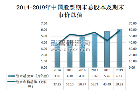 2018年中国股票期末总股本为5.76万亿股,期末市场总值为43.49万亿元;2019年中国股票期末总股本为6.17万亿股,期末市场总值为59.29万亿元。