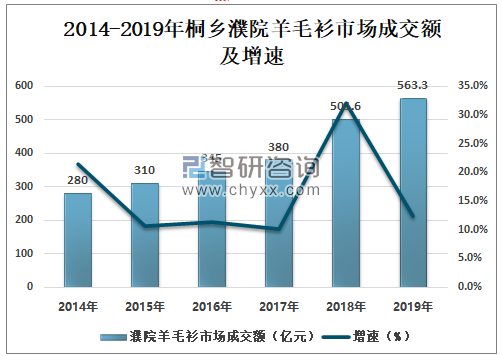 2014年以来桐乡濮院羊毛衫市场成交额呈不断上升趋势,2018年桐乡濮院羊毛衫市场成交额501.6亿元,较上年增长121.6亿元,同比增长32%;2019年桐乡濮院羊毛衫市场成交额为563.3亿元,同比增长12.3%,其中网上成交额为400亿元。