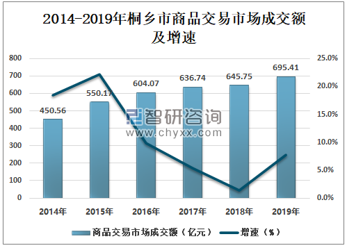 智研咨询发布的《2020-2026年中国羊毛衫行业市场调研分析及战略咨询研究报告》数据显示:桐乡市商品交易市场持续发展。2019年拥有各类商品交易市场67个,其中生产资料市场7个,消费品市场60个。市场成交额超亿元的市场有37个,其中5亿元以上市场18个。2014年以来桐乡市市场成交额呈逐年上升趋势,2019年市场成交额695.41亿元,同比增长7.69%。