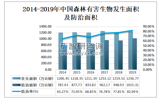 2019年中国森林有害生物发生面积为1236.77万公顷,防治面积为1015.31万公顷,防治率为近年最高,达到82.09%。
