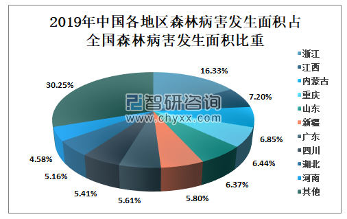 2019年浙江森林病害发生面积占全国森林病害发生面积的16.33%,江西森林病害发生面积占全国森林病害发生面积的7.20%,内蒙古森林病害发生面积占全国森林病害发生面积的6.85%。