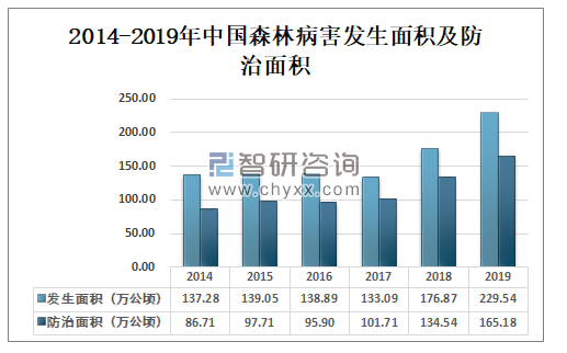 2017-2019年中国森林病害发生面积不断增加,2019年达到229.54万公顷,较2018年增加了52.67万公顷;2019年中国森林病害防治面积为165.18万公顷,较2018年增加了30.64万公顷。