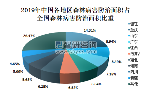2019年浙江森林病害防治面积占全国森林病害防治面积的14.31%,重庆森林病害防治面积占全国森林病害防治面积的8.94%,山东及广东森林病害防治面积占全国森林病害防治面积的比重分别为8.49%、7.18%。