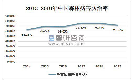 智研咨询发布的《2020-2026年中国森林资源行业市场全景调查及投资价值预测报告》数据显示:2017-2019年中国森林病害防治率逐年下降,2019年中国森林病害防治率为71.96%,较2018年下降4.11%。