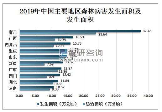 浙江森林病害发生面积最为严重,2019年浙江森林病害发生面积达到37.48万公顷,防治面积为23.64万公顷;江西森林病害发生面积为16.53万公顷,防治面积为10.96万公顷;内蒙古森林病害发生面积为15.73万公顷,防治面积为10.44万公顷。