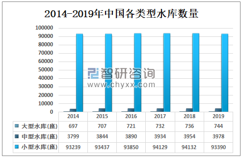 水库通常按库容大小划分,分为小型、中型、大型等。中国水库主要以小型水库为主,2019年中国共有93390座小型水库,中型水库3978座,大型水库744座。