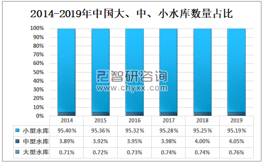 智研咨询发布的《2020-2026年中国水库工程行业市场调研分析及投资前景预测报告》数据显示:2019年小型水库数量占全国水库总数量的95.19%,中型水库数量占全国水库总数量的4.05%,大型水库数量占全国水库总数量的0.76%。