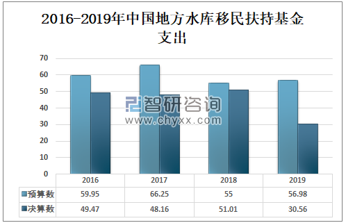 2019年地方水库移民扶持基金支出预算数为56.98亿元,较2018年增加了1.98亿元;地方水库移民扶持基金支出决算数为30.56亿元,较2018年减少了20.45亿元。