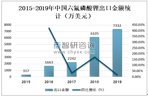 近年来中国六氟磷酸锂出口金额逐年攀升,2018年中国六氟磷酸锂出口金额为6105万美元,同比增长172.30%;2019年中国六氟磷酸锂出口金额为7332万美元,同比增长20.10%。
