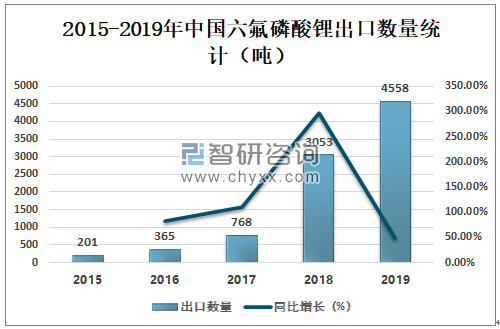 近年来中国六氟磷酸锂出口数量逐年攀升,2018年中国六氟磷酸锂出口数量为3053吨,同比增长297.53%;2019年中国六氟磷酸锂出口数量为4558吨,同比增长49.30%。