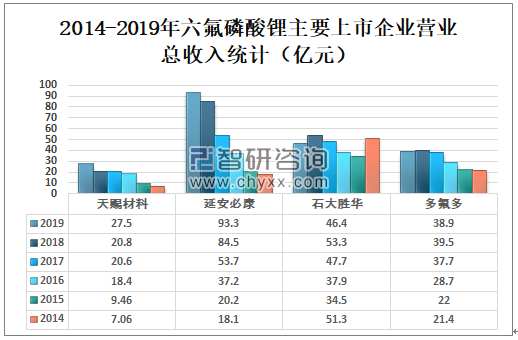 2014-2019年六氟磷酸锂主要上市企业营业总收入统计(亿元)