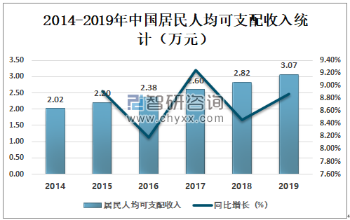 近年来中国人民生活水平提高,居民人均可支配收入逐年攀升,人们越来越注重养生,2019年中国居民人均可支配收入为3.07万元,同比增长8.87%,中国居民人均可支配收入持续增长,促进冬虫夏草市场需求的不断增长。