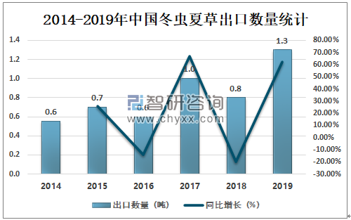 2018年中国冬虫夏草出口数量为0.8吨,同比减少20.00%;2019年中国冬虫夏草出口数量为1.3吨,同比增长62.50%。