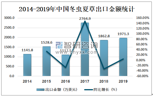 2018年中国冬虫夏草出口金额为1862.8万美元,同比减少32.63%;2019年中国冬虫夏草出口金额为1971.3万美元,同比增长5.82%。