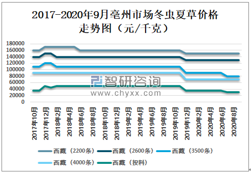 2020年9月亳州市场西藏冬虫夏草(2200条)价格为150000元/千克,与2020年1月持平;西藏冬虫夏草(2600条)价格为130000元/千克,与2020年1月持平;西藏冬虫夏草(3500条)价格为80000元/千克,较2020年1月减少了10000元/千克;西藏冬虫夏草(4000条)价格为70000元/千克,与2020年1月持平;西藏冬虫夏草(投料)价格为30000元/千克,较2020年1月减少了5000元/千克。