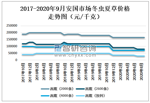 2020年9月安国市场西藏冬虫夏草(2000条)价格为165000元/千克,与2020年1月持平;西藏冬虫夏草(3500条)价格为80000元/千克,较2020年1月减少了10000元/千克;西藏冬虫夏草(4000条)价格为70000元/千克,与2020年1月持平;西藏冬虫夏草(投料)价格为30000元/千克,较2020年1月减少了5000元/千克。