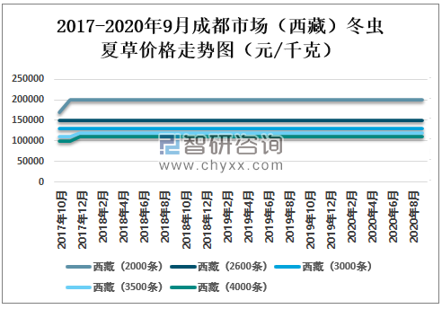 成都市场(西藏)冬虫夏草价格非常平稳,2020年9月成都市场西藏冬虫夏草(2000条)价格为200000元/千克,与2020年1月持平;西藏冬虫夏草(2600条)价格为150000元/千克,与2020年1月持平;西藏冬虫夏草(3000条)价格为130000元/千克,与2020年1月持平;西藏冬虫夏草(3500条)价格为120000元/千克,与2020年1月持平;西藏冬虫夏草(4000条)价格为110000元/千克,与2020年1月持平。
