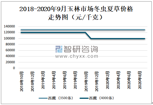 玉林市场冬虫夏草价格非常平稳,2020年9月玉林市场西藏冬虫夏草(3500条)价格为130000元/千克,与2020年1月持平;西藏冬虫夏草(4000条)价格为100000元/千克,与2020年1月持平。