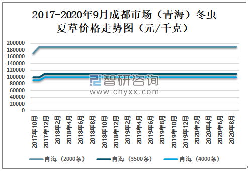 成都市场(青海)冬虫夏草价格非常平稳,2020年9月成都市场青海冬虫夏草(2000条)价格为190000元/千克,与2020年1月持平;青海冬虫夏草(3500条)价格为110000元/千克,与2020年1月持平;青海冬虫夏草(4000条)价格为100000元/千克,与2020年1月持平。
