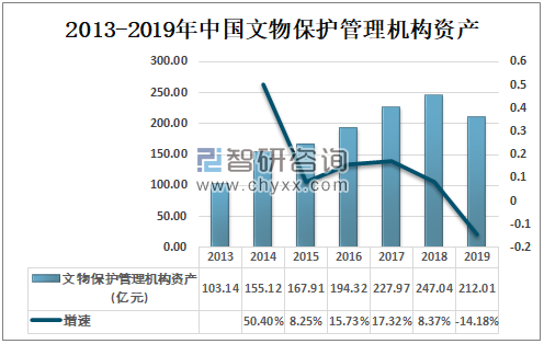 智研咨询发布的《2020-2026年中国文物保护行业市场运行潜力及营销渠道分析报告》数据显示:2013-2018年中国文物保护管理机构资产逐年增长,2019年首次出现下降;2019年中国文物保护管理机构资产总计212.01亿元,较2018年减少了35.03亿元,同比下降14.18%。