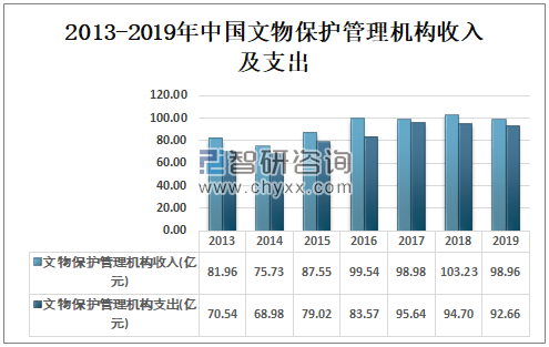 2018年中国文物保护管理机构收入为103.23亿元,支出为94.70亿元;2019年中国文物保护管理机构收入为98.96亿元,支出为92.66亿元;