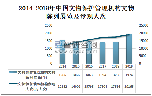 2018年中国文物保护管理机构共实现文物陈列展览1452个,参观人次达17616万人次;2019年中国文物保护管理机构共实现文物陈列展览1974个,参观人次达19165万人次。
