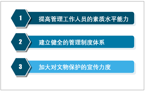 文物不仅承载灿烂文明、传承历史文化、维系民族精神,而且也是提高国家文化软实力的一部分。所以,我们更应该加强对文物的保护和管理工作,首先就是提高文物保护管理机构管理人员在文物保护方面的素质水平,同时还要建立建全的管理体系,加大对文物保护的宣传力度,要让全民都参与到文物的保护中来,这样才能保证中国的文物能一直传承下去。