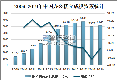 智研咨询发布的《2021-2027年中国办公楼行业市场发展调研及发展趋势预测报告》数据显示:2009-2017年中国办公楼完成投资额逐年增加,2018年有所回落,2018年中国办公楼完成投资额为5997亿元,同比减少11.3%,2019年较2018年有所回升,2019年中国办公楼完成投资额为6163亿元,同比增长2.8%。
