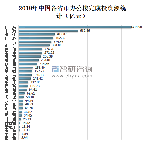 2019年广东办公楼完成投资额为1314.96亿元,全国排名第一;上海办公楼完成投资额为689.36亿元,全国排名第二;浙江办公楼完成投资额为419.87亿元,全国排名第三。