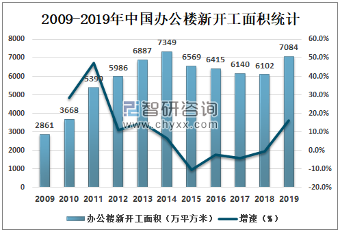 2009-2014年中国办公楼新开工面积逐年增加,2015-2018年开始逐年下滑,2018年中国办公楼新开工面积为6102万平方米,同比减少0.6%,2019年较2018年有所回升,2019年中国办公楼新开工面积为7084万平方米,同比增长16.1%。