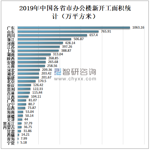 2019年广东办公楼新开工面积为1063.16万平方米,全国排名第一;山东办公楼新开工面积为765.91万平方米,全国排名第二;四川办公楼新开工面积为657.4万平方米,全国排名第三。
