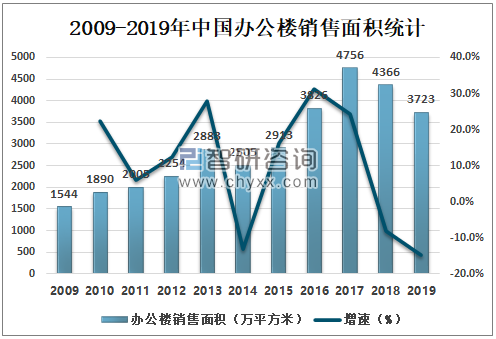 2014-2017年中国办公楼销售面积逐年增加,2018年开始下滑,2018年中国办公楼销售面积为4366万平方米,同比减少8.2%;2019年中国办公楼销售面积为3723万平方米,同比减少14.7%。
