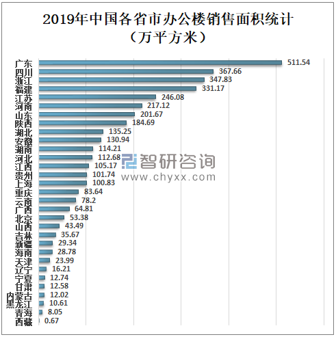 2019年广东办公楼销售面积为511.54万平方米,全国排名第一;四川办公楼销售面积为367.66万平方米,全国排名第二;浙江办公楼销售面积为347.83万平方米,全国排名第三。