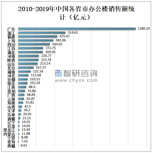 2019年广东办公楼销售额为1280.19亿元,全国排名第一;浙江办公楼销售额为514.61亿元,全国排名第二;福建办公楼销售额为425.47亿元,全国排名第三。
