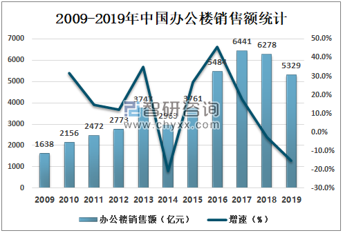 2014-2017年中国办公楼销售额逐年增加,2018年开始下滑,2018年中国办公楼销售额为6278亿元,同比减少2.5%;2019年中国办公楼销售额为5329亿元,同比减少15.1%。