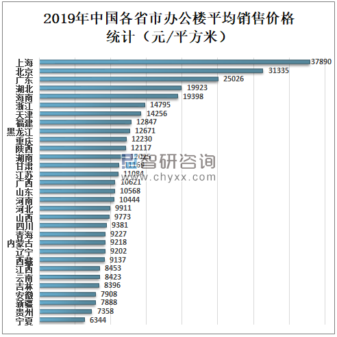 2019年上海办公楼平均销售价格为37890元/平方米,全国排名第一;北京办公楼平均销售价格为31335元/平方米,全国排名第二;广东办公楼平均销售价格为25026元/平方米,全国排名第三。