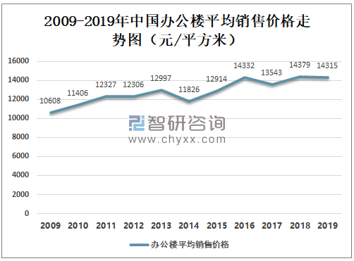 近十年来中国办公楼平均销售价格总体呈上升趋势,2018年中国办公楼平均销售价格为14379元/平方米,较2017年增长了836元/平方米;2019年中国办公楼平均销售价格为14315元/平方米,较2018年减少了64元/平方米。