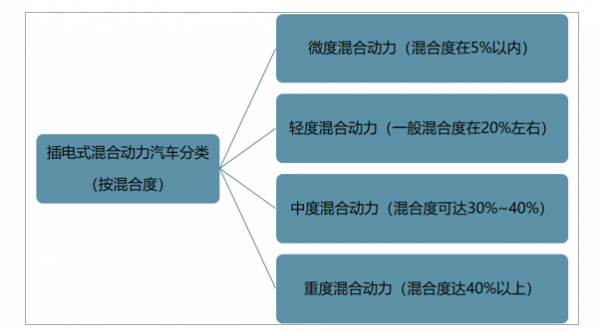 插电式混合动力汽车按照电机驱动功率占整车功率的比例(亦可称为混合度),一般可将混合动力汽车分成以下四种类型:(1)微度混合动力,混合度在5%以内;(2)轻度混合动力,一般混合度在20%左右;(3)中度混合动力,混合度可达30%~40%;(4)重度混合动力,混合度达40%以上。