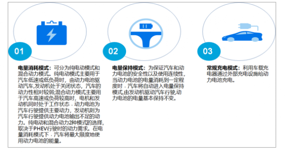 智研咨询发布的《2020-2026年中国混合动力汽车行业市场发展规模及投资前景趋势报告》数据显示:按照PHEV动力电池电量的变化特点,可将PHEV的工作模式分为电量消耗模式、电量保持模式和常规充电模式等3种。PHEV在运行过程中﹐根据整车控制策略,将电量消耗模式,电量保持模式和常规充电模式实现无缝衔接。