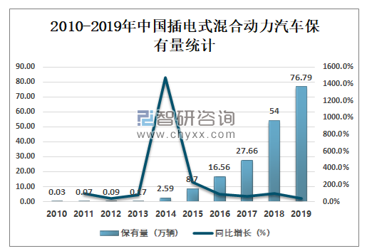 近十年来中国插电式混合动力汽车保有量逐年增加,2018年中国插电式混合动力汽车保有量为54万辆,较2017年增加了26.5万辆;2019年中国插电式混合动力汽车保有量为76.79万辆,较2018年增加了22.61万辆。