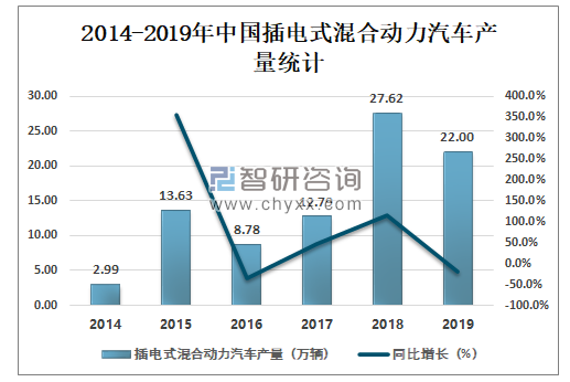 2016-2018年中国插电式混合动力汽车产量逐年增加,2018年中国插电式混合动力汽车产量为27.62万辆,较2017年增加了14.82万辆,2019年较2018年有所下滑,2019年中国插电式混合动力汽车产量为22.00万辆,较2018年减少了5.61万辆。