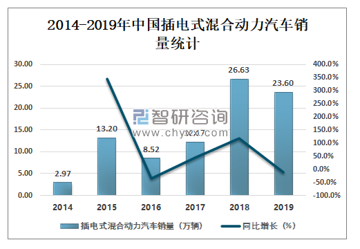 2016-2018年中国插电式混合动力汽车销量逐年增加,2018年中国插电式混合动力汽车销量为26.63万辆,较2017年增加了14.46万辆,2019年较2018年有所下滑,2019年中国插电式混合动力汽车销量为23.60万辆,较2018年减少了3.03万辆。