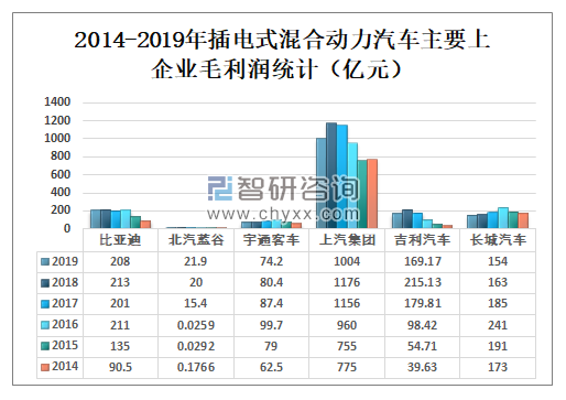 2014-2019年插电式混合动力汽车主要上企业毛利润统计(亿元)