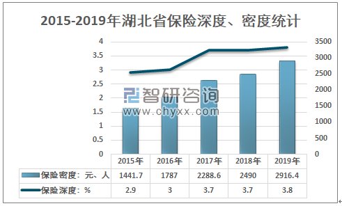 湖北省保险密度、深度持续上涨,2019年湖北省保险密度为2916.4元/人,同比增长17.12%;保险深度为3.8%。