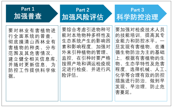 林业有害生物具有像水灾和火灾的损失性和危害性,防治上具有艰巨性和长期性,为此各级政府部门要加强普查、加强风险评估及进行治理的科学防控。