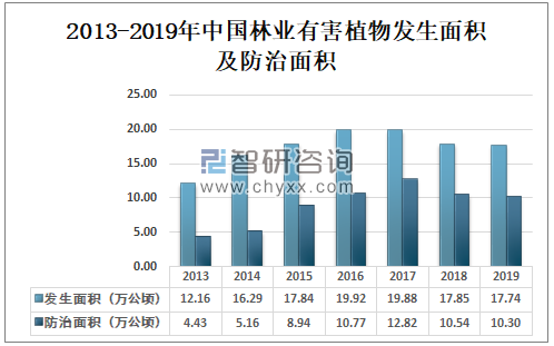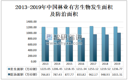 林业有害植物是林业有害生物的重要组成部分,2019年中国林业有害生物发生面积为1236.77万公顷,较2018年增加了17.25万公顷;2019年中国林业有害生物防治面积为1015.31万公顷,较2018年增加了66.38万公顷。