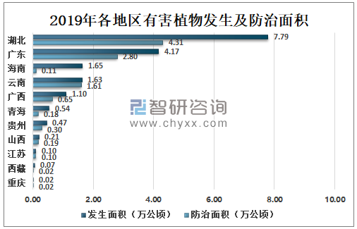 湖北地区林业有害植物发生及防治面积均居全国首位;2019年湖北林业有害植物发生及防治面积分别为7.79万公顷、4.31万公顷;广东林业有害植物发生及防治面积分别为4.17万公顷、2.80万公顷;海南林业有害植物发生及防治面积分别为1.65万公顷、0.11万公顷。